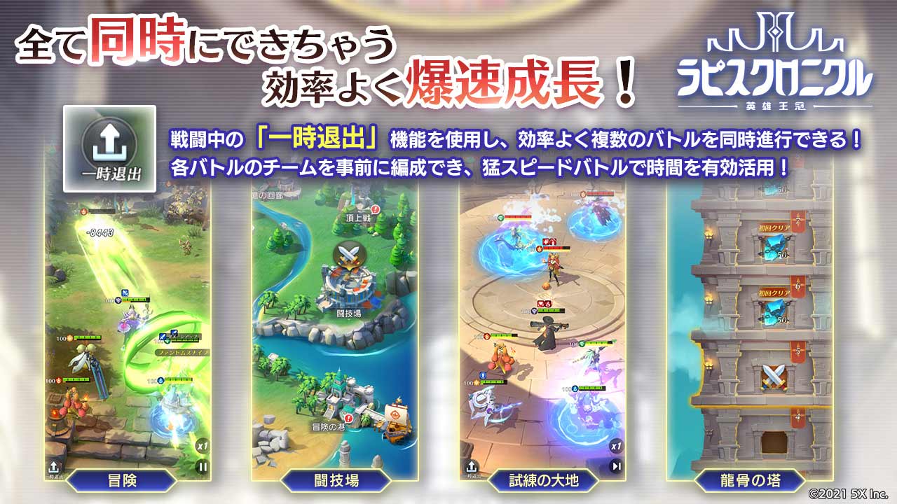 本作は戦闘中の一時退出機能を搭載しているので、複数のバトルを同時に進行することが可能です。 忙しくてもサクサク進められ、今まで体験したことのない効率的なプレイ体験ができます。