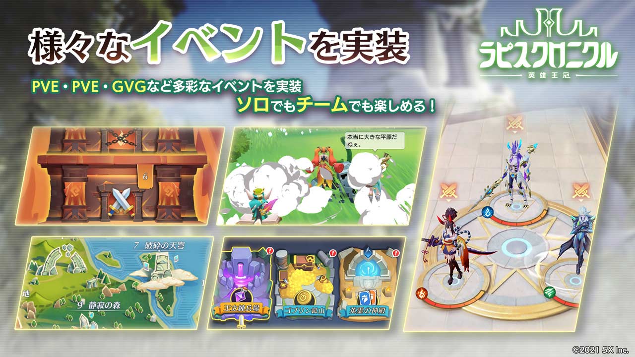 龍骨の塔(PvE)、闘技場(PvP)、遺跡探検(すごろく)、記憶の回廊(英雄ストーリー)、 ランク戦、オリジナルギルト対戦機能といった、多彩なコンテンツと様々なイベントを実装しています。 ソロでもチームでも楽しめる遊び方が無限大です!