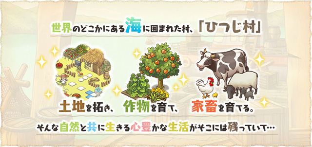 世界のどこかにある海に囲まれた村、「ひつじ村」 土地を拓き、作物を育て、家畜を育てる。 そんな自然と共に生きる心豊かな生活がそこには残っていて… ◇◆ゲーム紹介◆◇ 作物や動物を育てて あなただけの素敵な牧場を作ろう! 牧場シミュレーションゲーム ・作物や動物を育てて牧場を拡張 ・海の生き物も育てられる ・おとも動物を連れて無人島に探険 ・イベントに参加して期間限定アイテムをGET