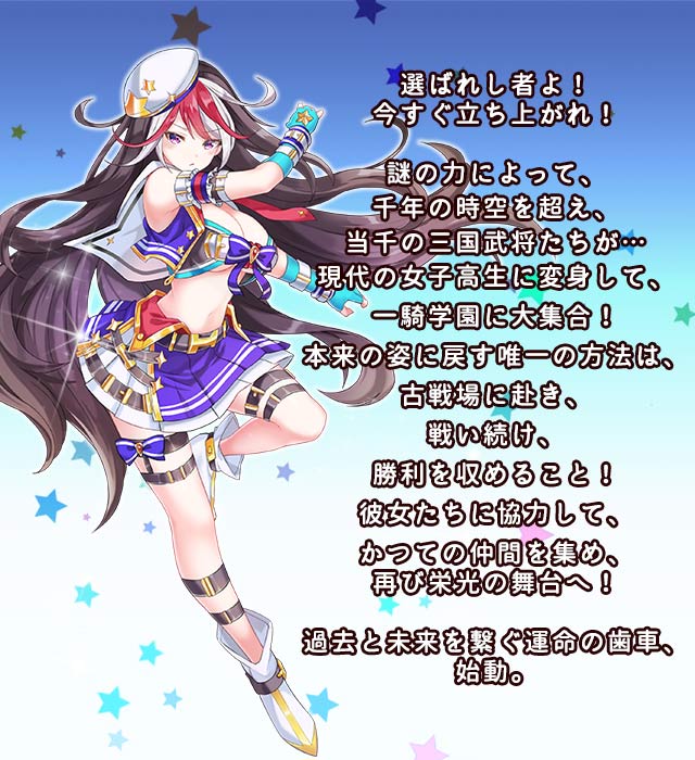 『皆が力を合わせた時、時空の扉が再び開かれる…』 美少女育成型カードバトル×戦略シミュレーションRPG 【ゲーム特徴】 ★圧巻!魅力あふれる三国志武将たち★ 総勢100名を超える三国史上の名将が美少女になって登場! お好みの少女を強く育てて! 一緒に波瀾万丈な学園生活を送りましょう! ★簡単操作ながら高い戦略性★ タップだけでド派手な演出と超爽快なバトルを体験! フルオートバトル搭載でレベルがどんどん上がっていく! 奥深いデッキ編成でやり込み要素満載! ★目指せ、三国統一!★ 三国時代の地図を再現、城郭の分布と領土が明らかに! 勝利を重ねたギルドだけが参戦できる頂上決戦! ギルドバトルを極め、領土を広げて天下統一を実現せよ! ★「一騎打ち」で灼熱のバトル展開★ 最強部隊を率いて気軽に腕試しだ! 対戦相手と真剣勝負、己の限界を突破せよ! ★強敵に立ち向かうため、ギルドを組もう★ 友達や仲間同士でギルドを組み、更なる敵を求めよう! みんなで力を合わせて勝ち抜け!