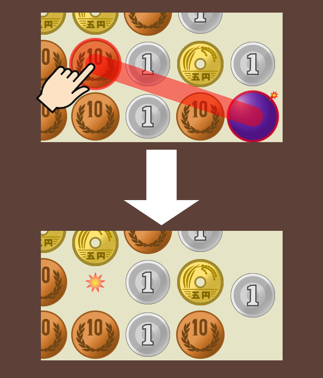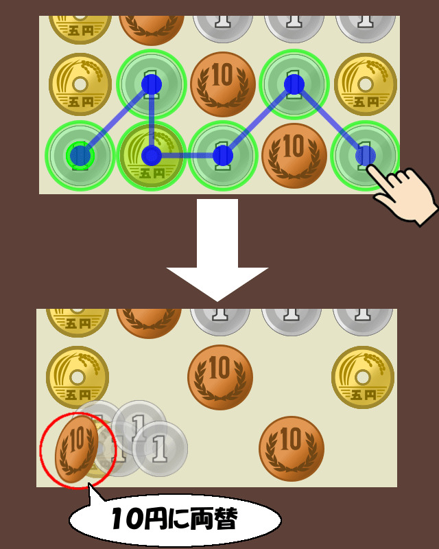 お金をなぞって両替します。 5円や10円など両替できる値ならば、どんなお金をいくつなぞってもOK。 なぞり始めの場所に両替されます。