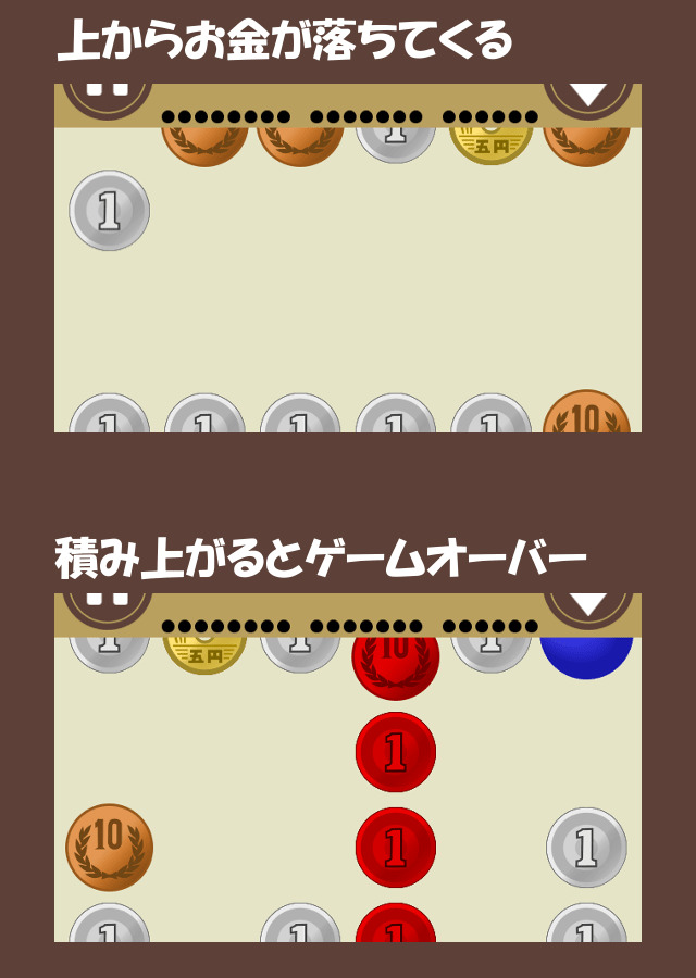 上からお金が1枚づつ落ちてきます。 上まで積み上がるとゲームオーバー。 いわゆる落ちものパズルです。