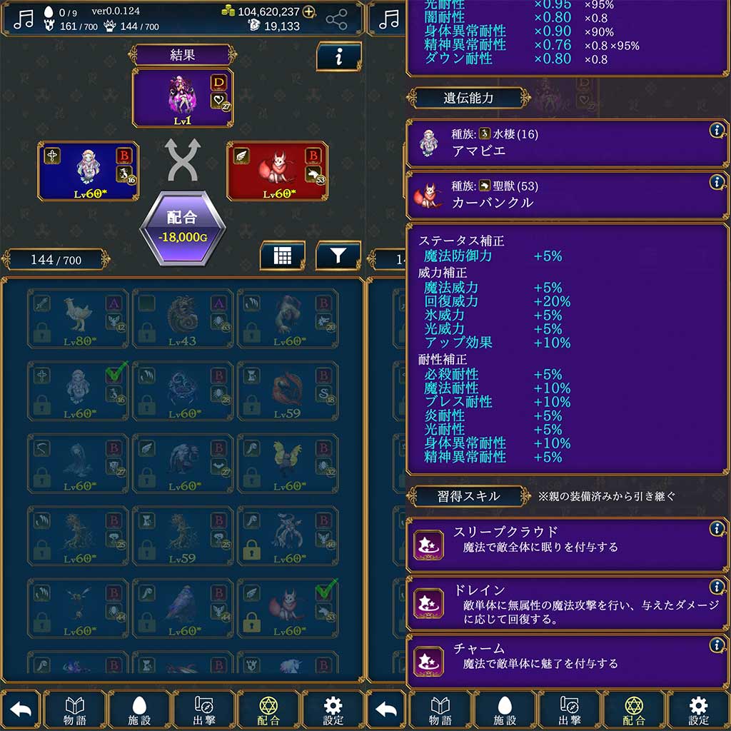 モンスターを2種類選んで配合するとモンスターのタマゴを獲得し、新たなモンスターが生まれます。モンスターの配合では「親のモンスターは失われません」。また、同じ子モンスターでも親モンスターの組み合わせで遺伝する能力が異なります。