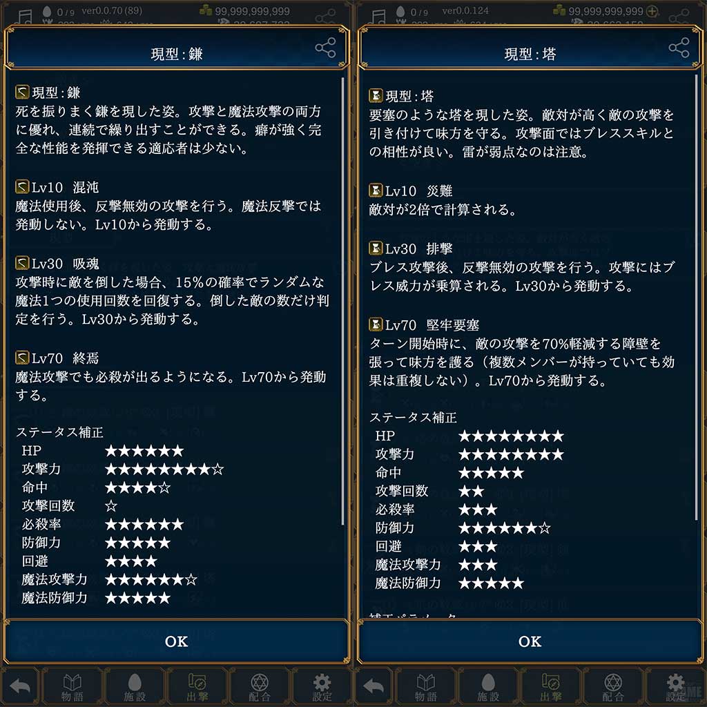 『現型』とは、「職業」に相当する概念で、モンスターは現型に応じてパラメータが代わり、強力なスキルを習得します。現型には基本的な 『剣』 『魔術』 を始め、少し特殊な 『鎌』 『塔』 など10以上の種類があります。モンスターの種族と相性の良い現型の組み合わせを探してみるのも楽しみの一つです。
