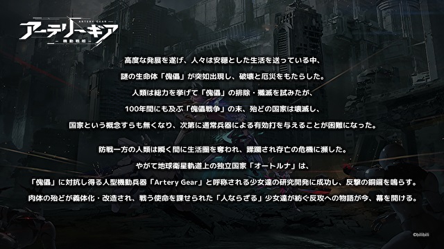 本作は未知の生命体「傀儡」による100年間にも及ぶ侵攻により荒廃した地球全土を舞台とし、プレイヤーはユニオン艦隊の旗艦「オートランド」の指揮官として、人型機動兵器『Artery Gear』(通称『AG』)と呼称される少女達を率いて、様々な戦いに身を投じることになります。 戦闘はターン制で進行される横スクロールコマンドバトル形式で、SDキャラクターによる細部まで作り込まれたド派手で華麗なモーションを楽しむことができます。各キャラクターの行動タイプ、属性や装備等の様々な組み合わせを生かし、幅広い戦略を駆使できます。 また、「人ならざる」少女達の物語を綴った壮大且つボリューム満点なメインストーリー等もお見逃しなく。