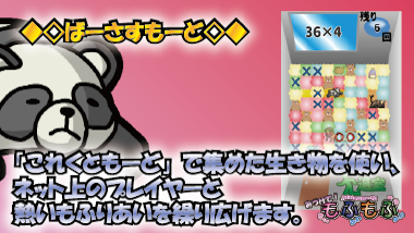 「これくともーど」で集めた生き物を使い、ネット上のプレイヤーと熱いもふりあいを繰り広げます。 目指せランキング1位ッ!