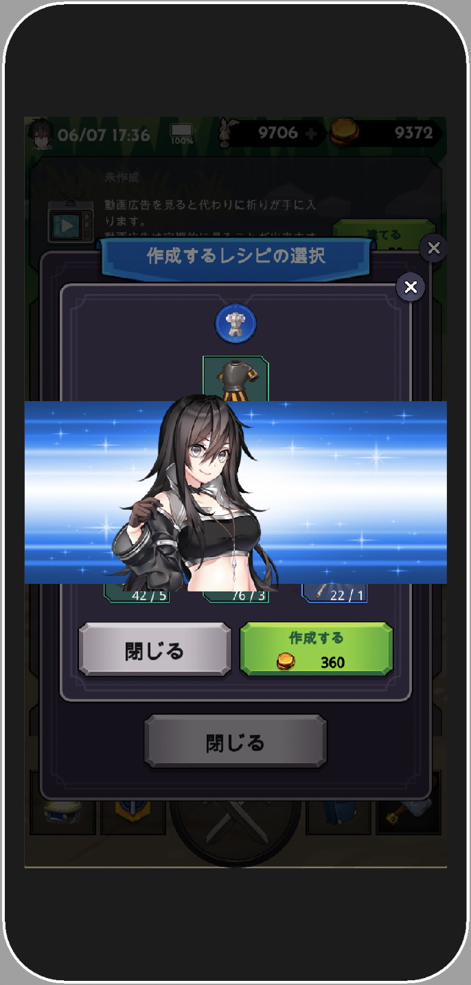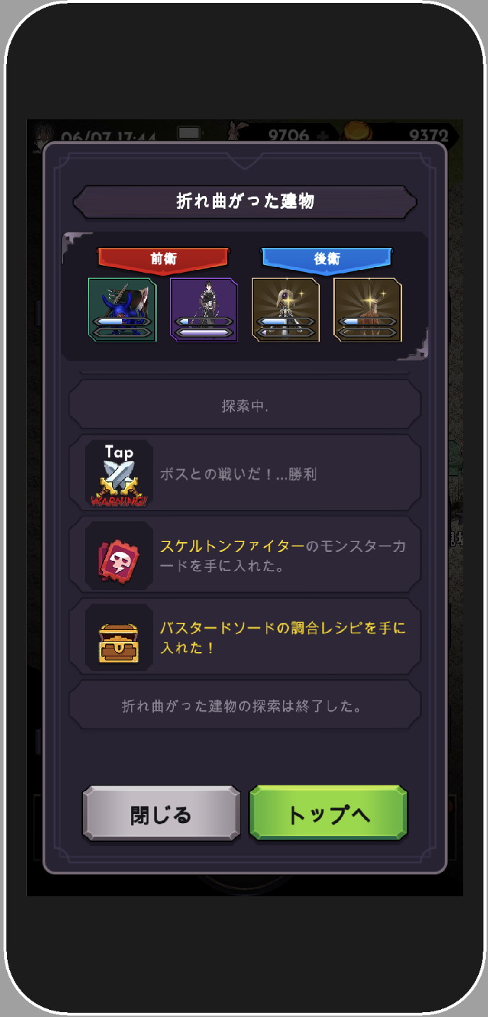パーティー編成で武器やスキルを装備させて冒険へ出そう! 冒険中に君の手をわずらわせる事はなく、冒険の様子を常に知らせてくれる。 冒険の最後には「レシピ」や「ジョブ」を見つけてくれることもあるよ!