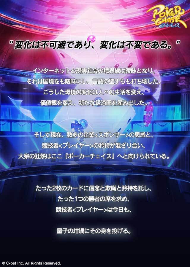 『2枚のカードに宿るのは虚か実か。』 バトロワ式オンラインポーカーゲームがこの夏リリース! “変化は不可避であり、変化は不変である。“ インターネットと現実社会の境界線は曖昧となり、それは国境をも曖昧にし、言語の壁すらも打ち壊した。こうした環境の変化は人々の生活を変え、価値観を変え、新たな経済圏を産み出した。 そして現在、数多の企業<スポンサー>の思惑と、競技者<プレイヤー>の矜持が混ざり合い、大衆の熱狂はここ『ポーカーチェイス』へと向けられている。たった2枚のカードに信念と欺瞞と矜持を託し、たった1つの勝者の席を求め、競技者<プレイヤー>は今日も、量子の坩堝にその身を投げる。 ■ポーカーチェイスとは プレイヤーに配られた2枚のカードとテーブル上に追加されていく5枚の共通カード(コミュニティカード)の、計7枚から5枚を使って手役を作り、 その役の強さによって勝敗が決まるテキサスホールデムポーカーを採用した“バトロワ式オンラインポーカーゲーム“です。 また登場する個性豊かで魅力的なキャラクター達は、ポーカーをプレイすることで好感度を上げることができ、一定の好感度をこえると“進化“を遂げ姿が変化したりその他、ゲーム内で使用できる新たなキャラクターボイスやスタンプが解放されていきます。 ■豪華キャスト&イラストレーター陣による魅力的な登場キャラクターたち! 吉良 紗幸 (きら さゆき) CV:相良茉優/イラスト:ねづみどし MEI² (メイメイ) CV:伊藤美来/イラスト:ふーみ ドクター・マリン CV:加隈亜衣/イラスト:yaman** シスター・レイン CV:赤﨑千夏/イラスト:yaman** クリスティアン・ブラック【進化前・進化後】 CV:【進化前】浪川大輔 【進化後】花江夏樹/イラスト:lack ジェイムズ・サンドマン CV:黒田崇矢/イラスト:ケースワベ 降谷 慈恩(ふるや じおん) CV:青木志貴/イラスト:ニリツ 加藤 小遥(かとう こはる) CV:渕上舞/イラスト:まふゆ トレイシー・レズナー ★本リリース後、追加アップデートで登場予定! CV:種﨑敦美/イラスト:ういり 尾神 亮二(おがみ りょうじ) ★本リリース後、追加アップデートで登場予定! CV:浅沼晋太郎/イラスト:小宮国春 ■概要 タイトル:『ポーカーチェイス』 リリース:2021年夏 ジャンル:バトロワ式オンラインポーカー 権利表記:© C-bet Inc. All Rights Reserved.