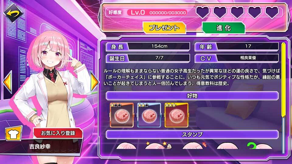 ポーカーをプレイしたりプレゼントをあげることでキャラクターとの好感度を上げることができ、一定の好感度をこえると”進化”を遂げ姿が変化するとか・・・!?その他、新たなキャラクターボイスやスタンプが解放されます。