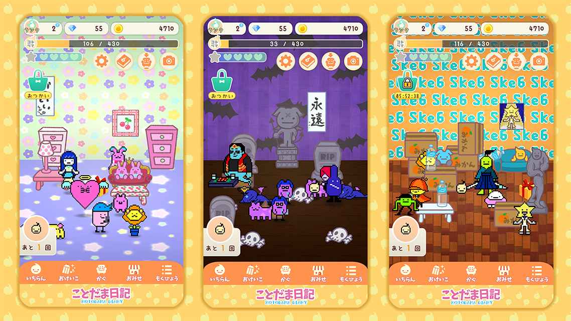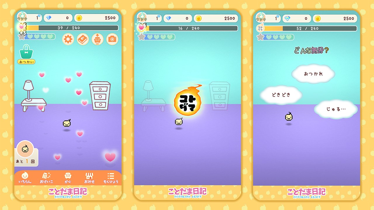 言葉でほのぼの育成ゲーム、ことだま日記。 iOS、Androidから2019年5月末にリリース予定です。 ぐだぐだおしゃべり、言葉で育てる育成ゲーム。 かわいいキャラに「タダ働き」の言葉をあげれば ぐったり闇堕ちするかも!? ●○● ゲーム内容 ●○● 「ことだまっち」に「コトダマ」を与えて成長させる育成ゲームです。 謎の生物「ことだまっち」。 「コトダマ」という魂がこもった言葉を食べさせると、時にキュートに、時にミステリアスに成長していきます。 最後にとんでもないものに育ってしまうかどうかは、あなたの選択次第です。 図鑑のコンプを目指して、探そう新種! 部屋を好みにカスタマイズ、散らかし放題! 元気な子にも陰気な子にも愛を与える、へんてこ育成? コミュニケーションを楽しみながら、ことだまっちを気楽に育てていきましょう。 ●○● 遊び方 ●○● ・タップやスワイプでハートを集めます ・ハートでゲージを溜めてコトダマを出現させます ・コトダマから分かれた言葉の中からひとつを選びます ・ことだまっちは言葉によっていろいろな性格に育ちます ●○●こんな人にオススメ!●○● ・暇つぶしにゲームをしたい ・癒しがほしい ・かわいいキャラが好き! ・キモかわ上等 ・クスッとしたい ・ゲームでキャラのお世話したことがある ・いろんな自分の部屋を作りたい! ・育成をやりこみたい ・なんとな~くゲームがしたい ・シュールっていいよね! Game Development Team Ske6 不具合などのゲームに関して:kotodama.diary@gmail.com 他お問い合わせ:ske6bento@gmail.com