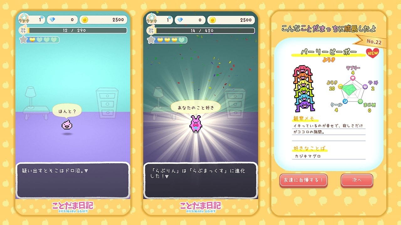 ・食べさせたコトダマによってことだまっちは反応を変えます。 ・ことだまっちはコトダマを幾つか食べさせると進化します。 ・最終進化をしたことだまっちは卒業していきます。 ・育て終われば、再び新しいことだまっちを育てられます。