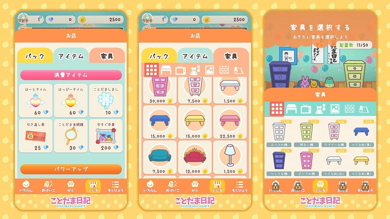 ・お店ではゲームを有利に進めるアイテムや、部屋の家具を購入できます