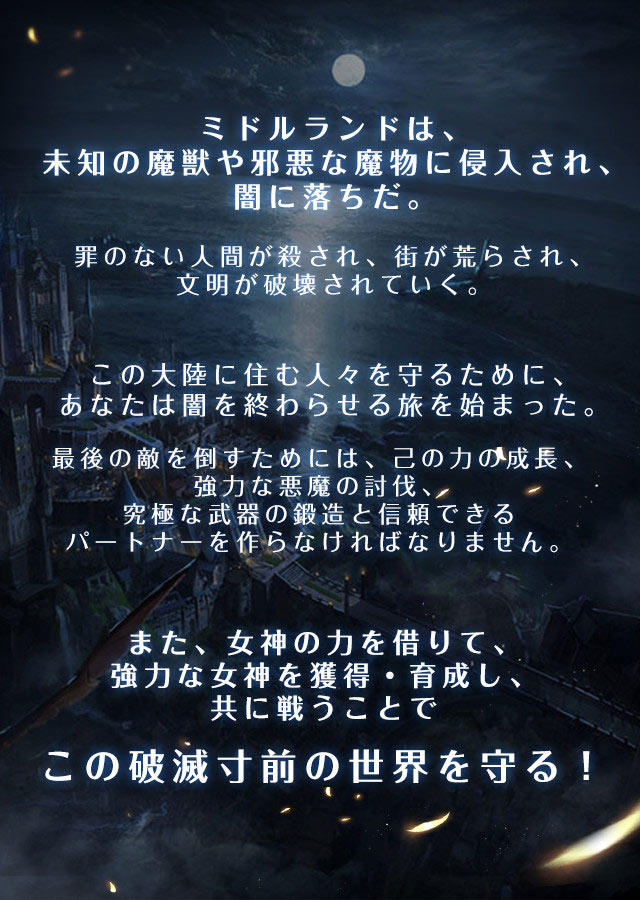 勇者として 女神と世界を守る! 時は中世、大陸では魔物とその手先が暴れ、大陸の平和を守る女神たちは身を潜めることを余儀なくされていた。 一方で、世界中に隠れている女神たちは、あなたとの出会いを待っています。女神と契約を結び、力を手に入れろ! 魔大陸の勇者たちよ、女神と世界を守るために旅に出ろ! 初期ボーナスたっぷり 勇者の道は辛くない 序盤で100連ガチャが引け、一気に装備やキャラを大幅に強化しよう! チュートリアルを完了すると、多くのリソースを手に入れることができます!キャラクターの成長や魔物への挑戦を容易にする! 放置でも冒険が続けらる 気軽に強くなれる! 「冒険」機能を搭載する!オフラインになってもキャラクターが大陸中のモンスターを倒しているので、キャラクターの成長を見守ることができます! 「冒険」中は「奇遇」があり、より有利な報酬が得られるかも? 全国の勇者たちと 凶悪のボスを倒せ! 各エリアには強力な領主がいるので、一人で行くのは無謀だ、ギルドメンバーと一緒に挑戦しろ! -ギルド全員でも倒せない強力な領主もいますよ。 全国の勇者の力を結集して、やつらを倒せ!