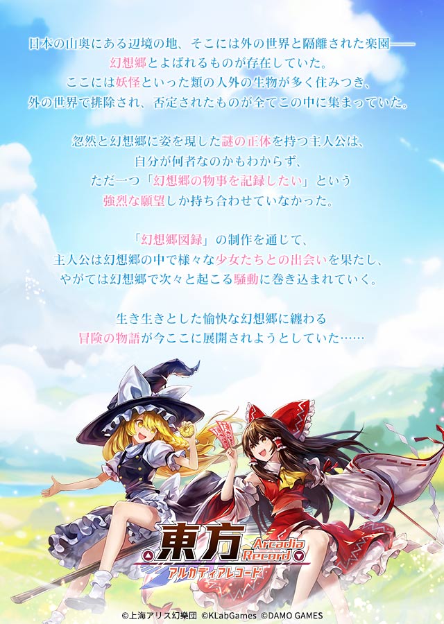 『東方Project』を題材とした横スクロール型の公認二次創作スマートフォンゲーム『東方アルカディアレコード』!ここから新たな幻想郷の記録が始まる! 幻想郷の個性溢れる愉快な仲間たちと共に、ワクワクが止まらない冒険に旅立とう! ☆自由に構築できるバトルシステム!☆ 原作を再現したフィールドやスキルに、最大5人まで出場できる自由なチーム構成!更に霊符システムで、自分好みのスキルを自由に作り出せ! ☆趣向を凝らしたゲームモード!☆ △屋敷△ 自分好みに部屋をアレンジしたり、漫画や音楽を鑑賞できるだけでなく、仲間と共に温泉や釣り、栽培、調理、探索など様々なミニゲームが楽しめる! △好感度△ 仲間にはそれぞれオリジナルストーリーが存在し、好感度が高まるにつれ新たなストーリーやボイスなどが解放されていく。 △霊符△   ボスにチャレンジすることでキャラの弾幕を再現した霊符を獲得でき、派手な弾幕で華麗にステージをクリアしよう! △幻想郷図録△ オリジナルのストーリーで幻想郷の仲間たちの新たな一面が見られる! 他にも楽しさが広がる遊び方が満載!どのような幻想郷を過ごすかはあなた次第! ☆躍動感あるストーリー!☆ 忽然と幻想郷に現れた主人公は「物事を記録したい」という衝動に駆られて、宇佐見菫子の案内の下、様々な異変に巻き込まれていく。幻想郷でしか起こりえない異変、その一部始終を目に焼き付けろ。 ☆人気の同人サークルや絵師の作品も多数収録!☆ △音楽サークル△ SOUND HOLIC、Foxtail Grass Studio、暁Records、IOSYS、凋叶棕、豚乙女、DiGiTAL WiNG、森羅万象、Demetori、UI-70、A-One、発熱巫女~ず、彩音~xi-on~、オーライフジャパン、アベニュールーム、Melodic Taste、少女理論観測所 and more!! △絵師△ 月野、なな、綾月すぐれ、ファルケン、あいに、Misekiss、ちびちび、キッカイキ、Dohyo、朱シオ、河地りんのアトリエch.、ふらすこ、マツモトトモヨヒ and more!!