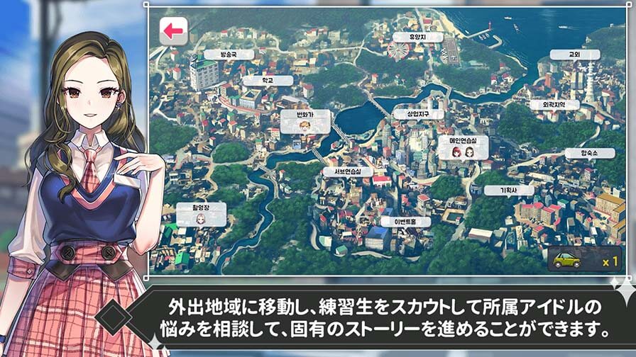 外出地域に移動し、練習生をスカウトして 所属アイドルの悩みを相談して、固有のストーリーを進めることができます。