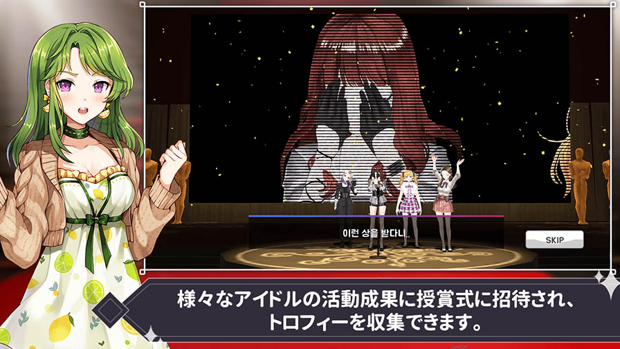 様々なアイドルの活動成果に授賞式に招待され、トロフィーを収集できます。