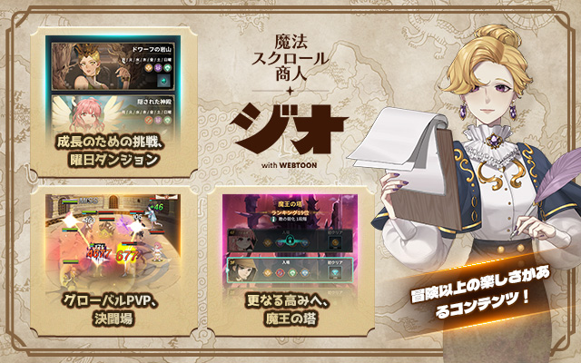 曜日ごとに変わる「ダンジョン」に挑戦して更に強力に成長し、「魔王の塔」の高いところまで到達すると莫大な報酬がもらえる!グローバルPVPコンテンツ「決闘場」で世界最強の座に挑もう!