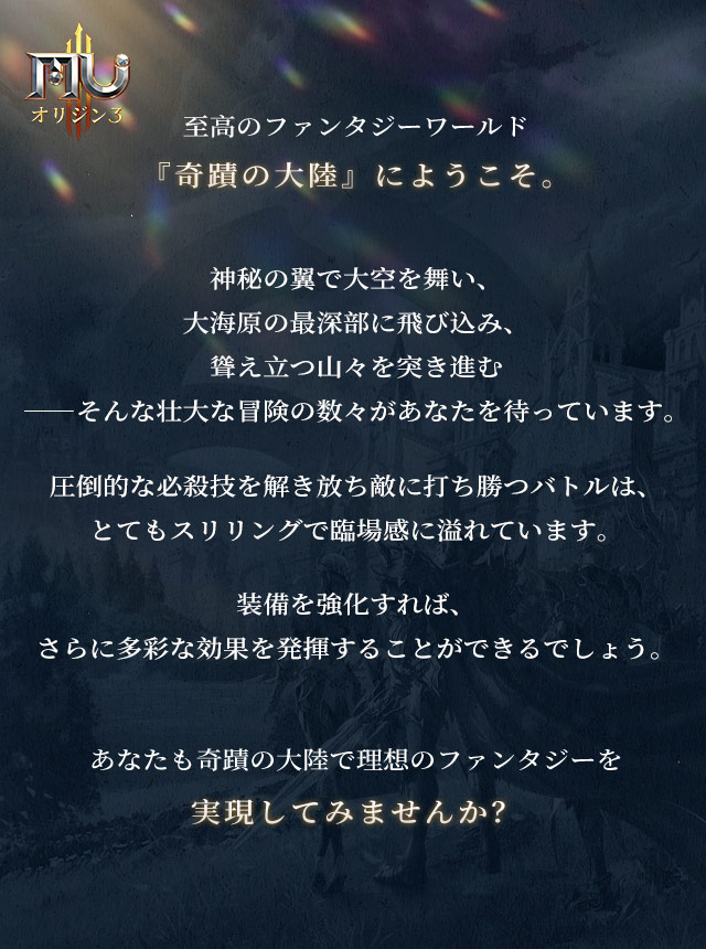 至高のファンタジーワールド『奇蹟の大陸』にようこそ。 神秘の翼で大空を舞い、大海原の最深部に飛び込み、聳え立つ山々を突き進む――そんな壮大な冒険の数々があなたを待っています。圧倒的な必殺技を解き放ち敵に打ち勝つバトルは、とてもスリリングで臨場感に溢れています。装備を強化すれば、さらに多彩な効果を発揮することができるでしょう。 あなたも奇蹟の大陸で理想のファンタジーを実現してみませんか? ★没入感を高める美麗グラフィック アンリアルエンジン4による洗練されたグラフィックが、あなたを神秘的な世界に誘う――臨場感あふれるファンタージワールドを堪能しよう! ★こだわりのキャラメイク 精巧で美しい装飾に雄大な翼――美を追求するか、武を証明するか、全てはあなた次第! ★どこまでも自由で広大なフィールド 最も深い場所から遥か高所まで自由自在!アトランティスの深海から氷結谷まで、奇蹟の大陸を遊びつくそう! ★スピーディーな爽快バトル 心震わす緊迫と興奮のバトルがここに! 世界を滅ぼさんとする悪魔に挑み、破滅から世界を救おう! ★マルチプレイも充実 仲間とチームを組んでバトルに挑もう! 頂点へ挑み、最強を目指せ! iOS端末:iPhone6以上 OS:iOS11以上 RAM:1GB以上 HDD:5GB以上利用可能
