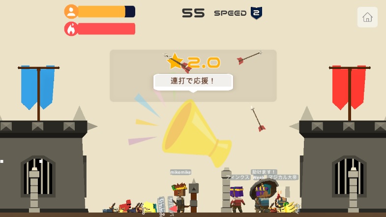 本作はチーム戦なので、早くやられてしまっても諦めてはいけません! 残った味方を応援する事ができます。 応援を受けた見方は、必殺技パワーと修理パワー(盾兵の場合)が溜まります。 生き残っている人数が少ないほど、多くのパワーを一人で受け取ることができます。 皆のパワーを受け取ったプレイヤーはまさに無双状態。 必殺技パワーがすぐ溜まる上に、盾の修理速度も爆速です! 皆の応援を受けて、逆転を狙いましょう!