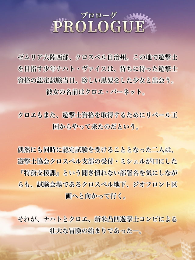 従来の軌跡シリーズと同じ世界(ゼムリア大陸)にあるクロスベル自治州、リベール王国、そしてレミフェリア公国を舞台に、ドラマチックなストーリーが展開。 原作おなじみのシステムに加えオンラインならではの要素を多数をプラスした新たなシリーズ作品が、ここに開幕―― (公式サイトより引用)