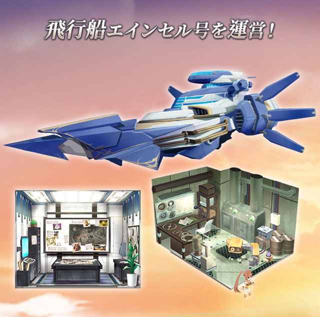 プレイヤーの拠点となる飛行船「エインセル号」では、改装することで様々なキャビンを設置できる。 キャビンにはキャラクターを自由に配置できるので、アイテム開発や料理などの作業を行わせて冒険の準備を整えよう。 (公式サイトより引用)