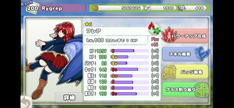 キャラクターは、HPやパンチ、魔法力など、 全8種類のステータスを持っています。 レベルアップだけでなく、 プラス値やスターランクなど、 キャラクターを強化する要素がたくさんあります。