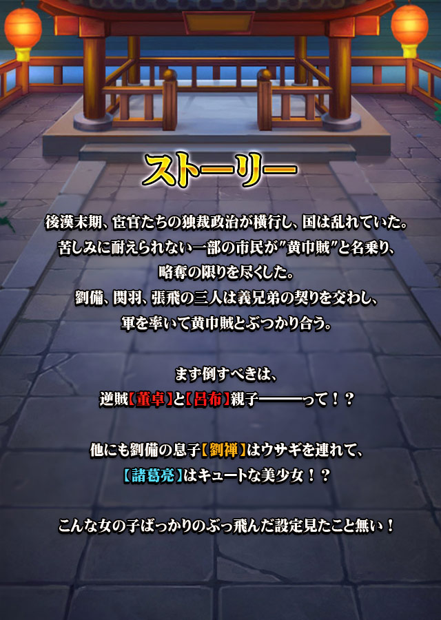 進化系三国志、ついにリリース! 「三国ガールズ」は、数々の武将や伝説が登場する逸話【三国志】を舞台とした、放置系SRPGです。 50人を超える歴戦の英雄たちが、カワイイ姿になって天下統一を目指して戦います。 プレイヤーは彼女たちの主君となり、お気に入りの武将を率いて成長させ、自分だけの軍団を作ることができます。 ■【三国ガールズ】の魅力や特徴をご紹介! ☆放置して天下統一!?オフライン報酬も充実! 「三国ガールズ」は自動で敵をなぎ倒し、自動で経験値を取得できる放置ゲームです。なので、忙しいプレイヤーもラクラク成長させることができます。 ボスにも自動で挑戦できちゃうので、寝て起きたら…大幅レベルアップ!なんてことも。 難しい操作も必要ないので、どんな方でも気軽に遊ぶことができるのが特徴です。 ☆個性的な武将たちのド派手なバトル! 「三国ガールズ」に登場する武将たちはちょっと変わっています。まさに新しい三国志! みんなが知っているあの有名武将たちも、個性的な見た目で登場します。 あなたの好きな武将はどんな姿で登場するのか!?お気に入りの武将を見つけましょう! 見どころは武将たちの必殺技!他の三国志ゲームでは見ることのできない、特徴的でド迫力な技が見ものです。 ☆やりこみ要素MAXの多彩な成長コンテンツ! 「三国ガールズ」には“15”を超える多彩な育成方法が存在します。 装備や武将の強化はもちろん、神獣や神器といった特殊な育成方法も! また、自分の城では「資源の回収」や「試練に挑戦」など、やるべきことはたくさんあります。 さらに、他のプレイヤーと城を取り合う「争奪戦」や、仲間と協力して戦う「討伐」など協力プレイも充実! ■【三国ガールズ】あらすじ 後漢末期、宦官たちの独裁政治が横行し、国は乱れていた。 苦しみに耐えられない一部の市民が"黄巾賊"と名乗り、略奪の限りを尽くした。 劉備、関羽、張飛の三人は義兄弟の契りを交わし、軍を率いて黄巾賊とぶつかり合う。 まず倒すべきは、逆賊【董卓】と【呂布】親子―――って、正史と違くない!? 他にも劉備の息子【劉禅】はウサギを連れて、【諸葛亮】はキュートな美少女!? こんな女の子ばっかりのぶっ飛んだ設定見たこと無い!