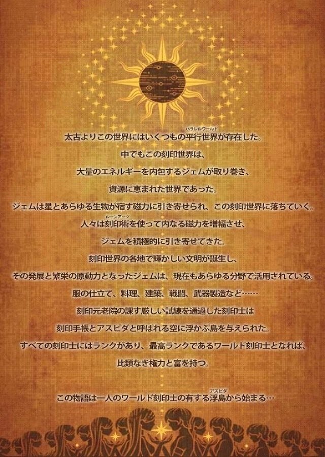 太古よりこの世界には、いくつかの平行世界が存在している。 複数の世界の中、多くの生物が生活する。 豊かな資源——ジェムに恵まれ、「刻印術」を使って生活のあらゆる面を支える世界は刻印世界と呼ばれている。