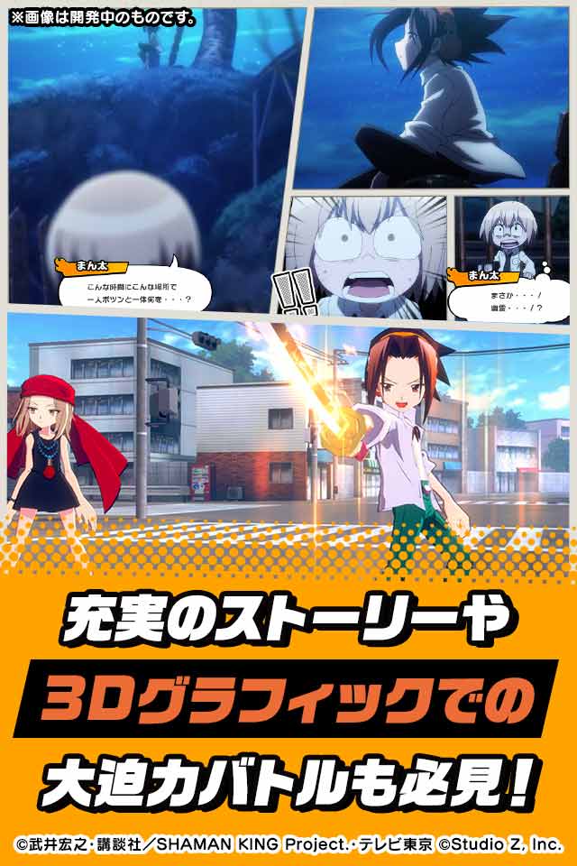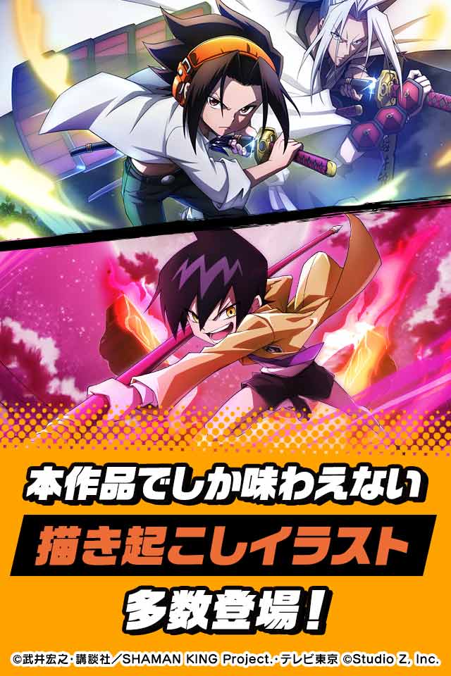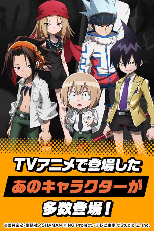 TVアニメに登場したあのキャラクターたちが多数登場し、昔からのファンはもちろん、 初めて『SHAMAN KING』に触れる方でも楽しめる初の公式スマートフォン向けゲームアプリ!