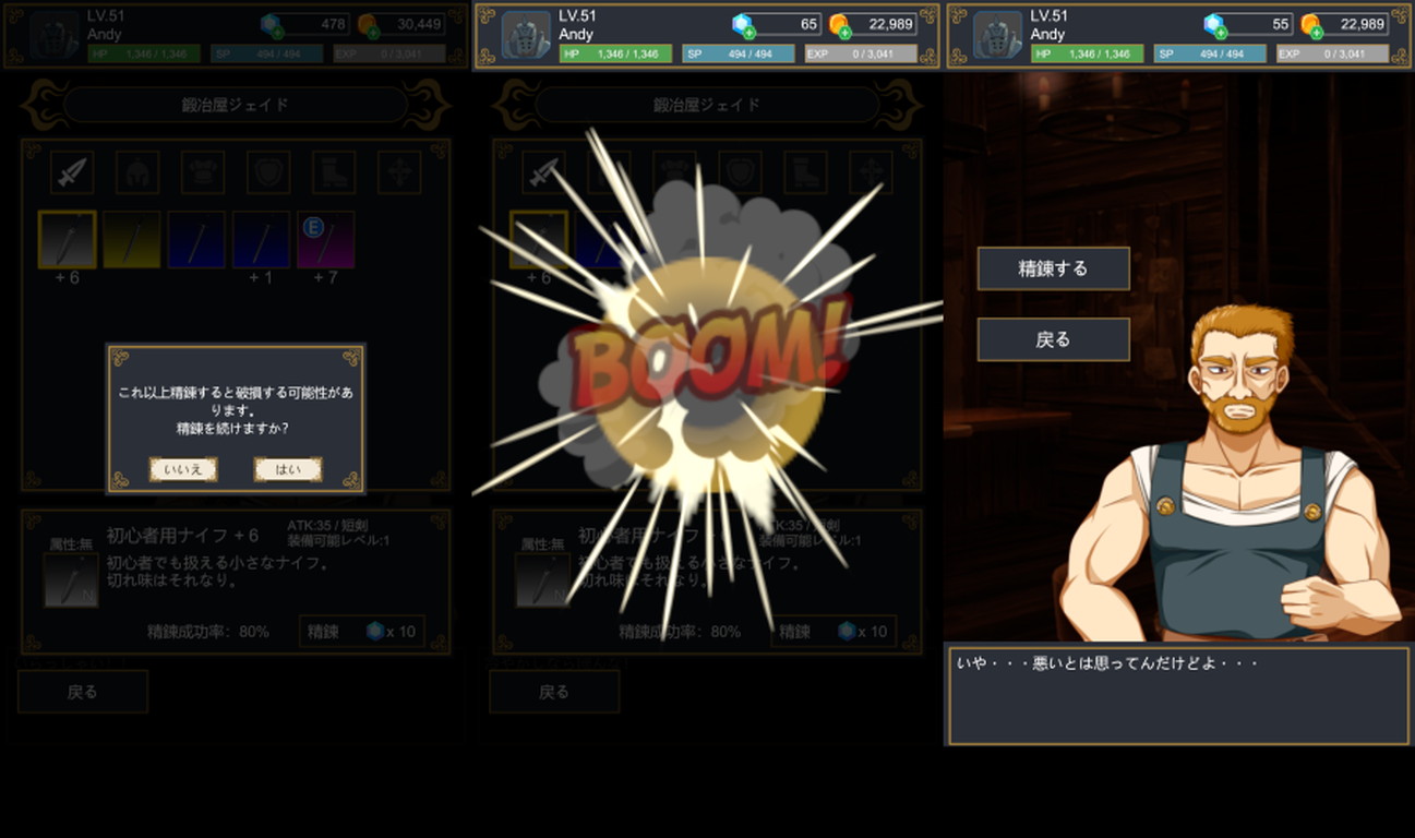 お気に入りの武器・防具を鍛冶屋で強化しよう。 鍛冶屋のジェイドは、どんな装備でも強化できるぞ! たまに失敗するけど・・・。