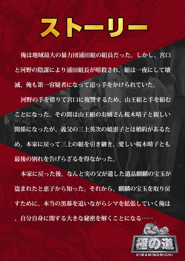 ヤクザの世界観をメインにしたRPG経営シミュレーションゲーム。 混乱に落ちいたその世界に、組織を作り上げ、各地の兄弟を集める! 資産を経営しながら、自分のシマを拡張していき、いつか闇世界の頂上の座を奪い取る…?!