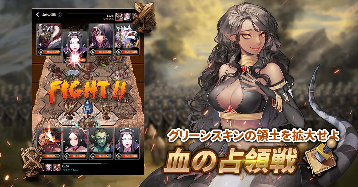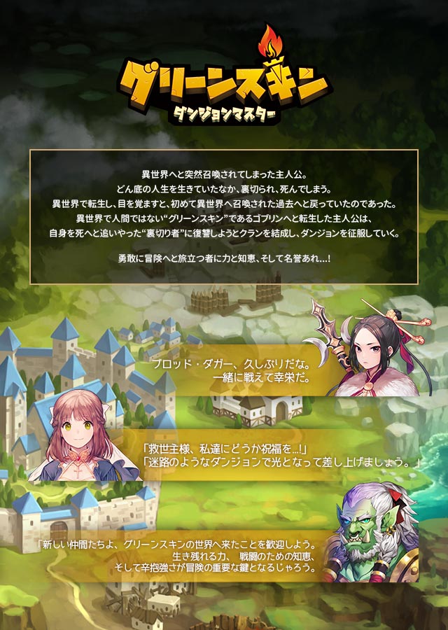 ★新規ユーザーへの特別プレゼント★ モバイルゲーム「グリーンスキン:ダンジョンマスター」 事前登録で探検の準備はカンペキ! リリース後に皆様の冒険スタートを応援するプレゼントをご用意致しました! [5つ星キャラ 'メブ' + 4つ星キャラ確定券 + 1,000ダイヤ + 100,000ゴールド] 「あなたの前に現れた未知の世界、ここグリーンスキン大陸では偉大な冒険家を待っています」 罠とモンスターに打ち勝ち、ダンジョン探検に成功する偉大な冒険家って...もしかしてあなたですか....? #油断は禁物_ローグライク! 失敗するとスタート地点に!?アイテムはすべてランダムに! ダンジョンには輝く宝物が溢れている?それとも危険がいっぱい!? 最後まで油断は禁物のハラハラドキドキの探検が今、始まる! #クラン_ 勇気を持って挑戦するあなたに「力」と「知恵」を…! あなただけのクランで未知のダンジョン探検に出かけよう! 戦闘キャラはもちろん、目的地探索、宝箱発見、罠感知、等のスキルを持つキャラクターまで勢ぞろい! # 装備_伝説の武器の「本当の持ち主」になろう! 一般~伝説ランクまで3000種余りの装備中、最高ランクのアイテムには隠された能力が! 伝説ランクの「儀式クエスト」を遂行して強力な能力を目覚めさせよう! #ヒロインをあなただけの幸運の女神に! ダンジョン探検をして、ヒロインからの好感度を上げよう! ヒロインからのクエストを遂行すると、ヒロインからの祝福により、 ダンジョン探検がいとも簡単に! #終わりのない迷宮_誰も立ち入ったことのない地下ダンジョン 危険なダンジョンの中に潜む強力なモンスターを倒して、ビックなお宝を手に入れよう! 負けたとしても、ボーナス能力値をゲットして再挑戦できます! #血の占領戦_領土をかけた熾烈な戦い! クランを編成して新しい土地を攻撃、占領しよう! 防衛に失敗して、占領した地域を奪われても大丈夫! 反撃するチャンスがあなたを待っています。 クランの運命をかけた勇敢な挑戦に「力」と「知恵」そして「名誉」が共にあれ ▽▲推奨環境▲▽ iOS 9.0以上 Android 4.2以上 [サポート] support@greenskin.zendesk.com