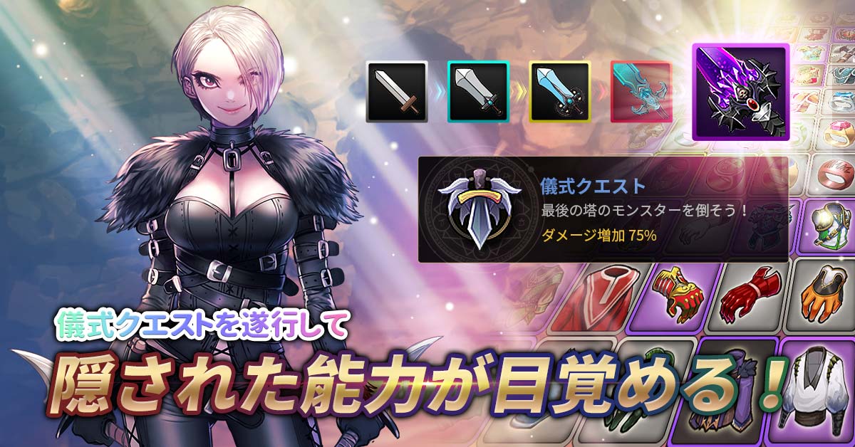 「私を持ち主として認めてくれないだって?」 グリーンスキンのダンジョンには一般~伝説ランクまで、 3000種余りのアイテムには隠されています。 そのうち、特に伝説ランクの装備はアツいアイテム! 伝説ランクのアイテムは、アイテムごとに隠された能力があります。 「儀式クエスト」を通じて装備の本当の持ち主になり、強力な能力を目覚めさせましょう!