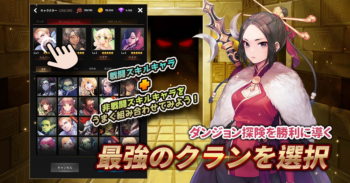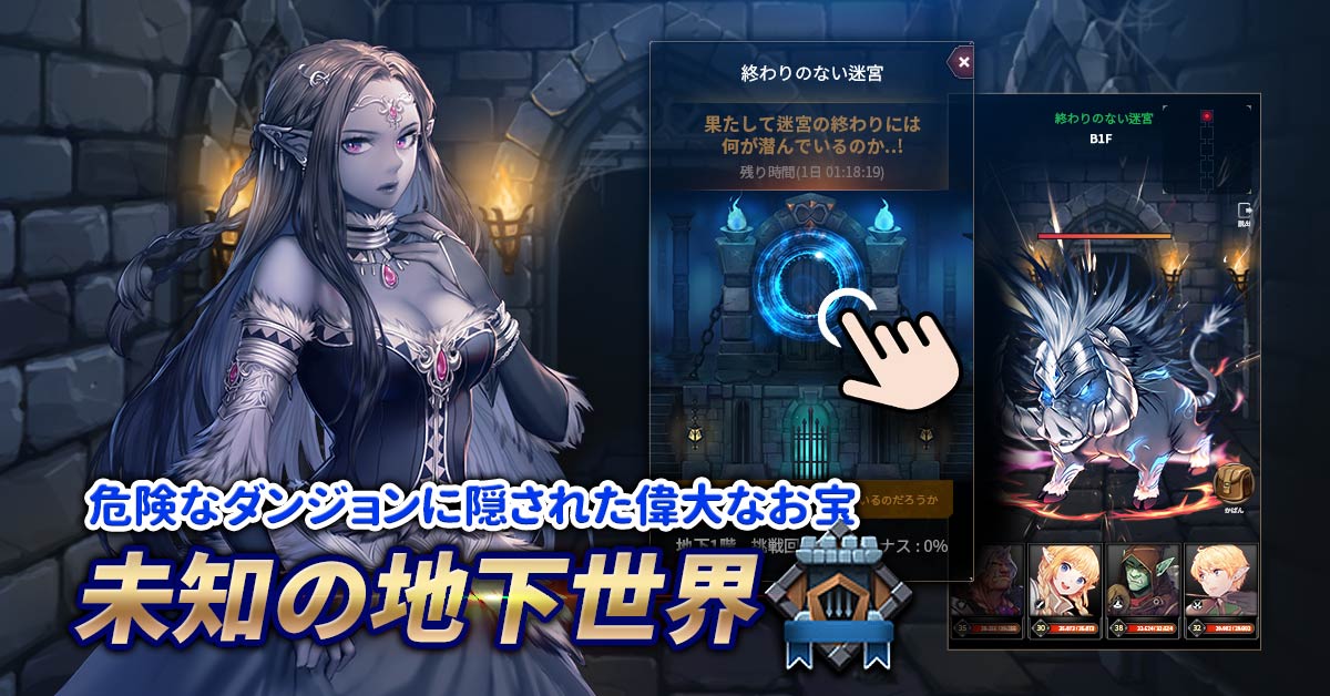 地下には終わりの見えない隠されたダンジョンが!? 迷宮には物理、魔法に抵抗がある強力なモンスターが待っています。 4人から構成されるデッキで強力なモンスターを倒しましょう。 危険なダンジョンには大きな報酬があるもの! もし負けたとしても大丈夫!能力値ボーナスで更に強くなった力で再挑戦できます! 挑戦回数が多ければ多い程、ボーナスが多くなるので心配NO!
