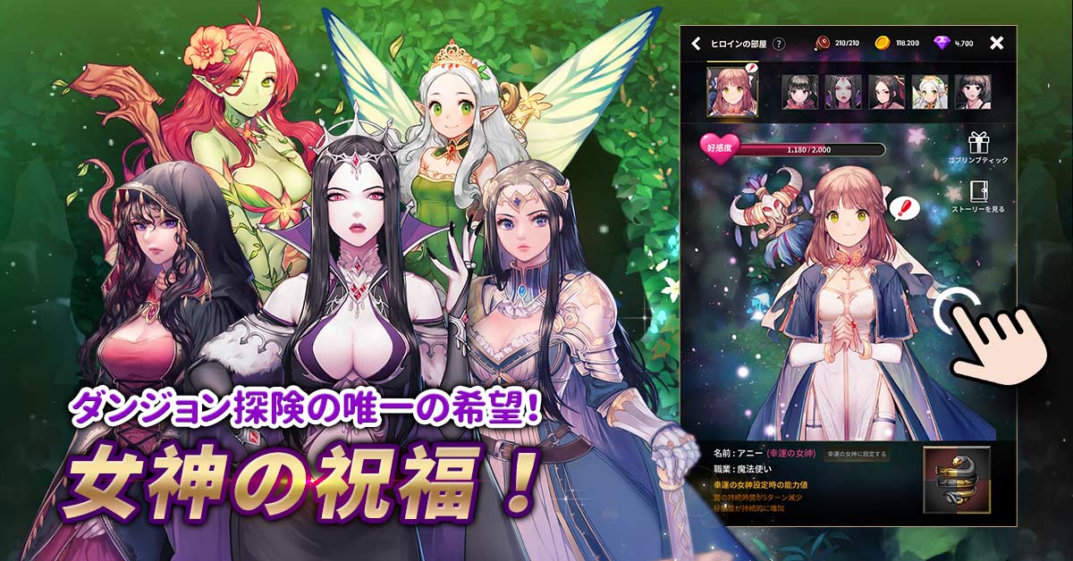 ヒロインがあなただけの幸運の女神に!? ダンジョン探検の途中で出会う様々なヒロインからのクエストを遂行したり、 宝物をプレゼントしてみよう! ヒロインたちの好感度をゲットすると、祝福を受けることができます! 個性豊かな魅力を持ったヒロインのうち、どのヒロインを選択しクエストを遂行するのか、 また、誰に宝物をプレゼントして好感度を高めるかはあなた次第! ヒロインたちがダンジョン探検の重要なカギになることをお忘れなく...!