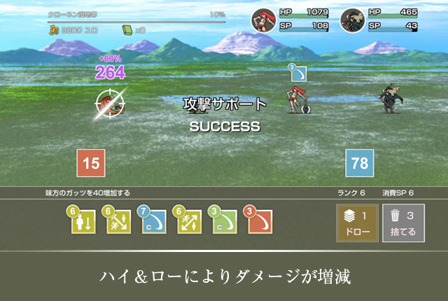 アタッカーの攻撃、防御、死亡の際にサポートが発生。 ハイ&ローを的中させるとダメージを増減する。 成功ボーナスでサポーターのSPも1回復する。