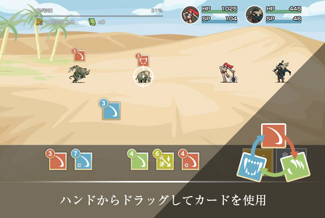 緑→青→赤の3すくみを利用した後出しジャンケン。 相手の攻撃カードを見てから有利なカードをドラッグで選択。
