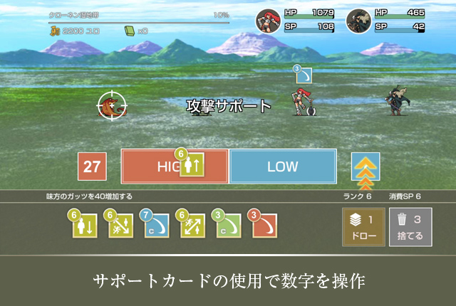 アタッカーの攻撃、防御、死亡の際にサポートが発生。 ハイ&ローを的中させるとダメージを増減する。 成功ボーナスでサポーターのSPも1回復する。