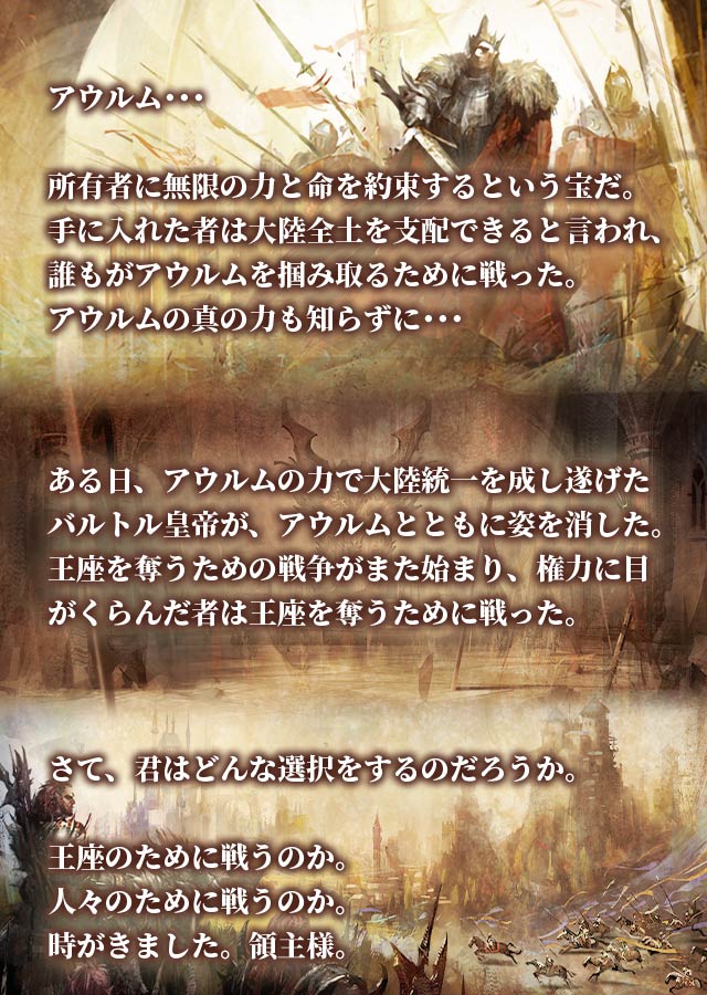領主様、時が来ました。 10.29リリース決定! ■ 次世代戦略シミュレーションRPG Unreal Engineで開発した超ハイグラフィック戦略ストラテジーに収集要素、RPGを結合させた 何から何まで次元の異なる世界を堪能できる ■ 極限スケールの戦略バトル! 軍団兵力を駆使し、自分だけの最強軍を編成 大規模スケールで迫力満点の軍団戦 ■ 圧巻のRPGダンジョン戦 もはや戦略ゲームとは思えない異次元のバトル 英雄たちによるド派手なスキルの打ち合いで臨場感あふれるバトルを体感できる。 ■ 魅力満載の100種の英雄たち 各国の特色を活かした多様な英雄が仲間に! ダンジョン戦闘で得られる素材で成長させ、装備を整え、最高の側近たちで覇権を狙う。 ■ 多種多様な勢力と領地拡大 西洋、東洋、北欧、中近東と様々な勢力が混在 自分好みの勢力で領地を守り、領土を拡大 農業都市にするか軍事都市にするかはあなた次第