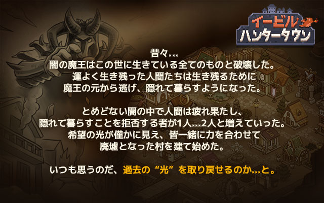 ハンタータウンを率いる賢明な村長募集中!自分の好みに合わせて村を再建、個性抜群のハンターたちを育成してモンスターに勝利しよう! 誰でも簡単プレイ可能!ピクセルアートでレトロ感溢れるシミュレーションRPGの魅力を体感してみよう! 自由に動き回るハンターも村長の命令に合わせて特定の行動をさせることが可能です! 最強のハンターたちと一緒に邪悪なモンスターを追い出し、村を取り戻そう! 人間界の運命はあなたの手にかかっています!