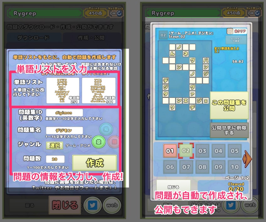 単語リストを用意することで、 自動で問題を作成することができます。 良い問題が作れたら、公開してみましょう! 公開された問題は、他の人がダウンロードできるようになります。