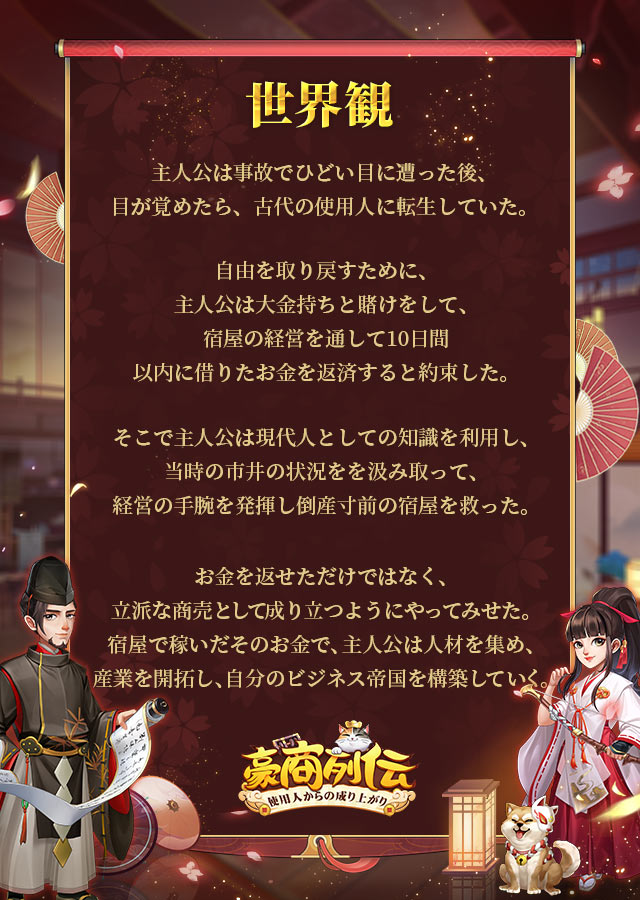 目が覚めたら、古代に転生していた!? 知らない人に、無理やり「結婚」と要求される!? 代々受け継がれてきた老舗を守るために、今日から商売を始めましょう! (無一文になるか、大豪商になるか、あなたの経営次第だよ!) 自分の代わりに、給仕と門客を募集すれば、気楽にお金を儲けられるよ! ===古代の町の絶景を満喫=== 気楽に遊べて、おもしろい展開盛りだくさん! 繁栄な古代の町を再現!古代の風情を体験しよう! ===古代で商売の腕を見せよう=== 雑貨屋から銭荘まで……様々なお店が経営できる! 大爆笑な物語を体験しつつ、現代人としての頭脳と手腕で古代商界を制覇しよう! ===美人と門客の助力=== 千年に一度の美人と縁を結び、素敵な一夜を満喫しよう! 経営は有力な門客たちにお任せ!抜け目のない彼らならどんな困難も乗り越えられる! ===かわいいペットとの出会い=== 愛嬌のあるミッケ猫、凛凛としたサラブレッド…さらに、伝説の珍獣まで飼育可能! 門客と美人の助力となり、彼らの能力を大幅に強化!! ===跡継ぎシステムで天才を育てよう=== 好きな人と巡り会い、二人の間に子供も…?!愛が深ければ産まれる子の素質も高くなる! さらに、跡継ぎに結婚相手を探し、人脈を広げて、どんどん家業を拡大していこう! ===共存共栄こそ成功への道=== 沿海から内陸、楼蘭から天竺。 経営をすれば競合は避けられないけど、商会を作り上げ、商売仲間を招いて協力していればどんな競合ライバルも勝てるだろう!