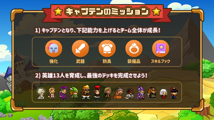 強化・成長・覚醒などのキャプテン能力値が上昇すると、全英雄の能力値もUP! 農家・パン屋さん、酔っ払い…個性溢れる13人のキャラクターをアベンジャーズに育てよう!