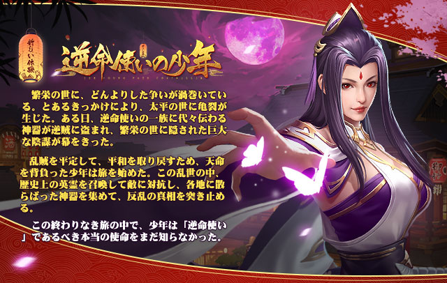 美しい古風世界を背景とした3Dターン制バトルスマートフォンRPG。プレイヤーは、逆命使いの少年少女となり、各歴史時代の有名人物と共に叛乱勢力と戦い、太平の世の裏に隠された巨大な陰謀を阻止する。