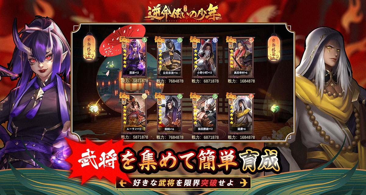 80名以上歴史名人、多様な属性とスキル。覚醒突破で名将達の能力を大幅にアップさせ、更に新しいイメージをゲット! 曹操、項羽、出雲阿国、真田幸村など各時代の代表人物が次々に戦場へと加わり、各種名将を集めて、あなたの思う最強陣営を作り上げよう!