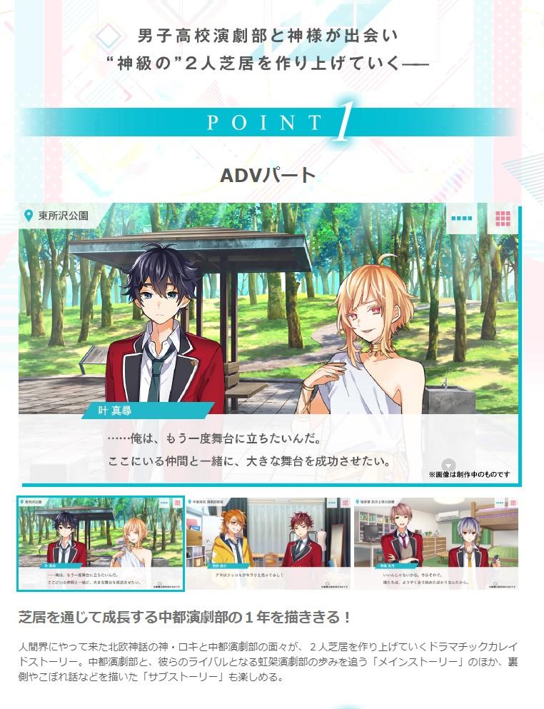 人間界にやって来た北欧神話の神・ロキと中都演劇部の面々が、2人芝居を作り上げていくドラマチックカレイドストーリー。中都演劇部と、彼らのライバルとなる虹架演劇部の歩みを追う「メインストーリー」のほか、裏側やこぼれ話などを描いた「サブストーリー」も楽しめる。 (公式サイトより引用)