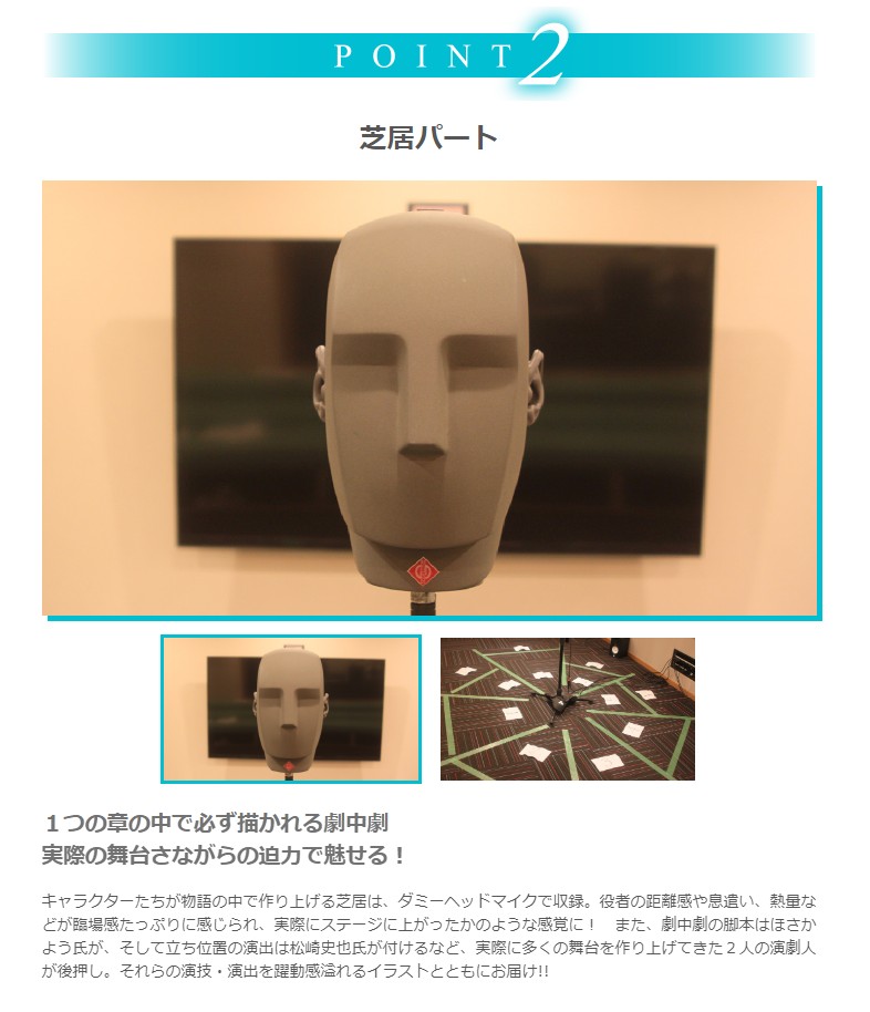 キャラクターたちが物語の中で作り上げる芝居は、ダミーヘッドマイクで収録。役者の距離感や息遣い、熱量などが臨場感たっぷりに感じられ、実際にステージに上がったかのような感覚に! また、劇中劇の脚本はほさかよう氏が、そして立ち位置の演出は松崎史也氏が付けるなど、実際に多くの舞台を作り上げてきた2人の演劇人が後押し。それらの演技・演出を躍動感溢れるイラストとともにお届け!! (公式サイトより引用)