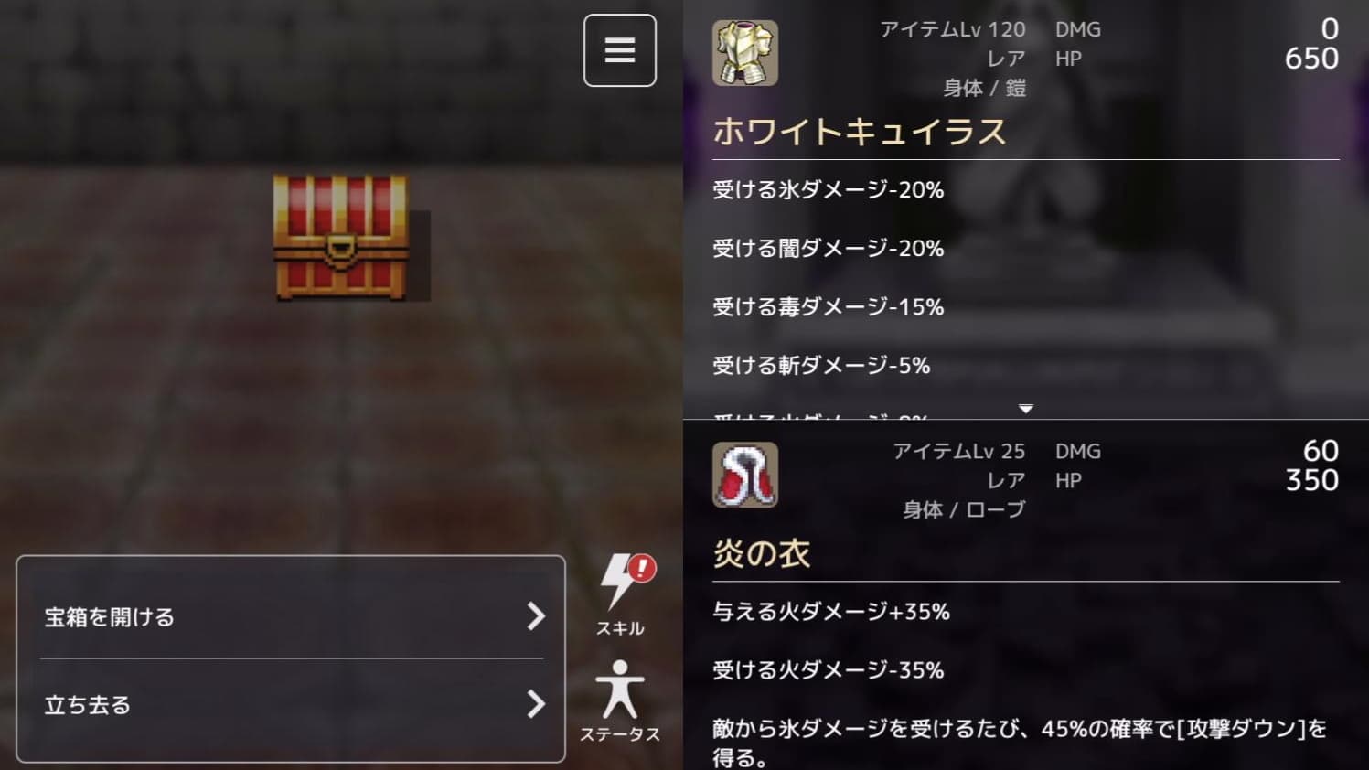 装備にはランダムに効果が付与され、ドロップの中から1つだけ選んで装備します。