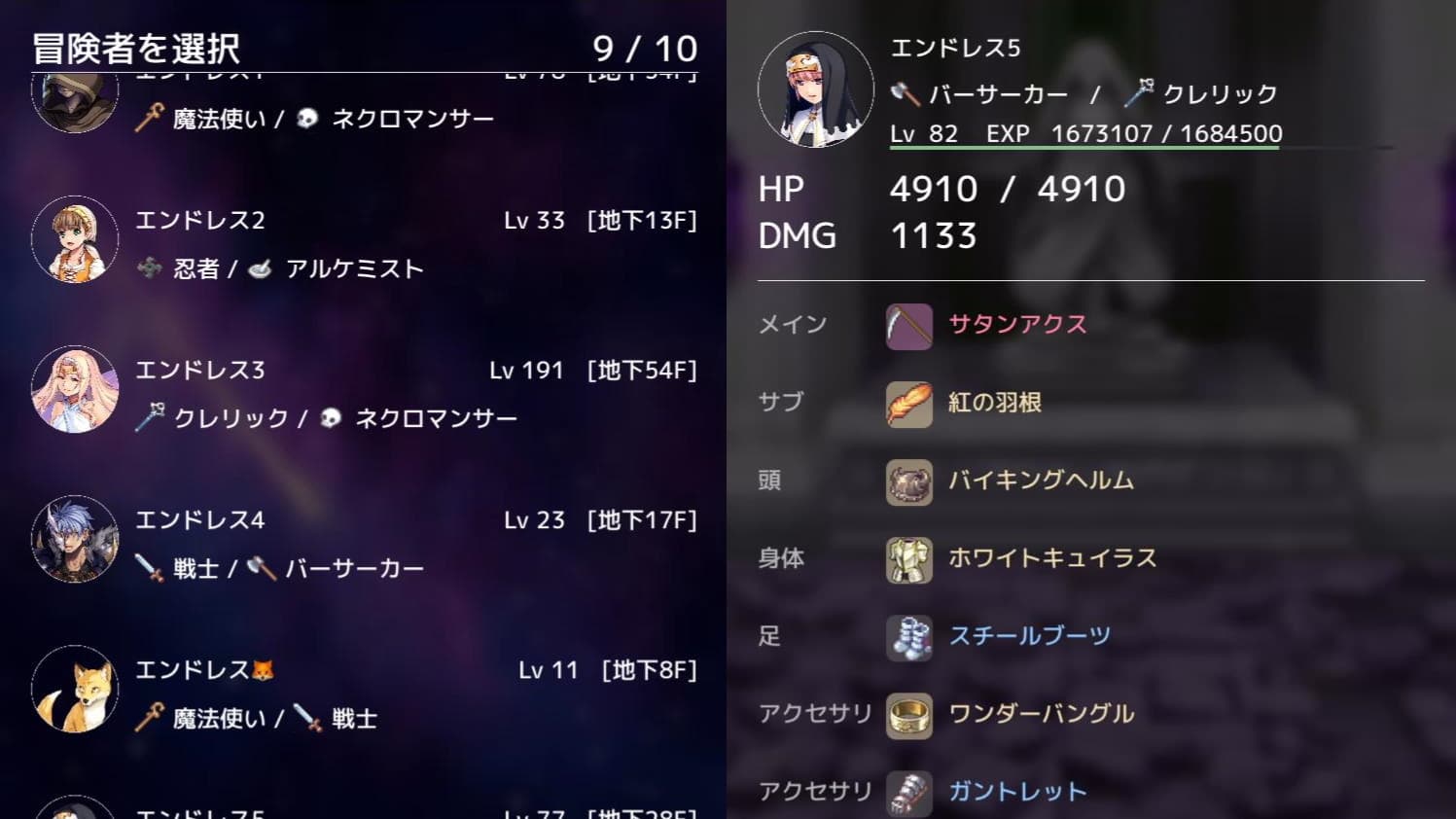 どこまでダンジョンの奥深く潜れるか挑戦! 全滅しても途中で復活し、ひたすらキャラクターを強くできるエンドレスモードもあります。