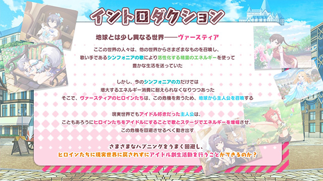 ヒロインたちが異世界で初めての「アイドル」として成長していく物語をフルボイスで楽しもう! ライトノベル感覚で楽しめるメインストーリーに加え、それぞれのヒロインたちの物語やイベント展開も充実。